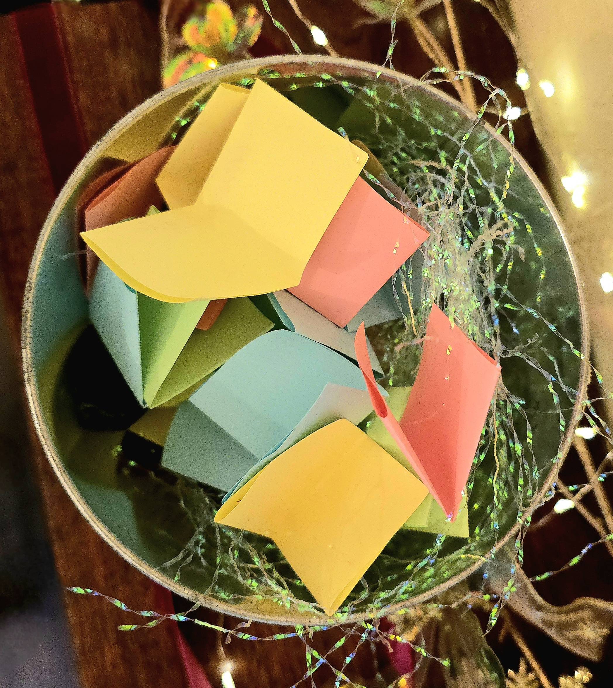 It’s simple. Find a nice Christmasy pot or tin and fill it with activities on little folded pieces of paper. I usually put together a little Christmas craft tray at the beginning of the season so that everything is at hand, and the fun can begin without me searching for glue sticks or sticky tape! But the dips don’t all have to be crafts. Choose activities that suit your family and your plans – and ideally, ones children can do independently if needed. If you don’t have time for baking mince pies, don’t include that option!