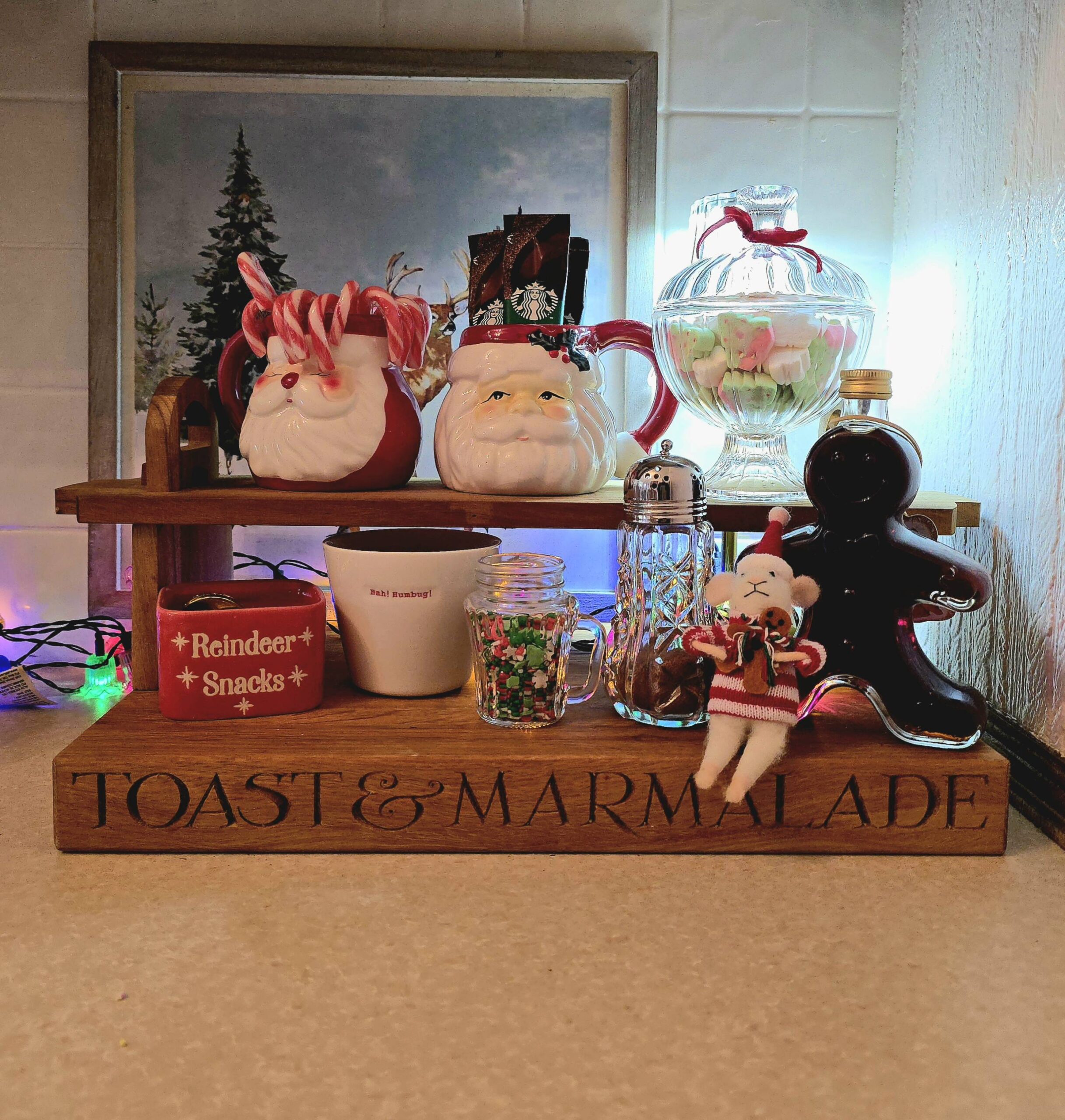 This year, feeling much more sensible than usual, I positioned my hot cocoa bar near the kettle! I made use of this incredibly handly display/serving shelf amd filled it with goodies as usual.