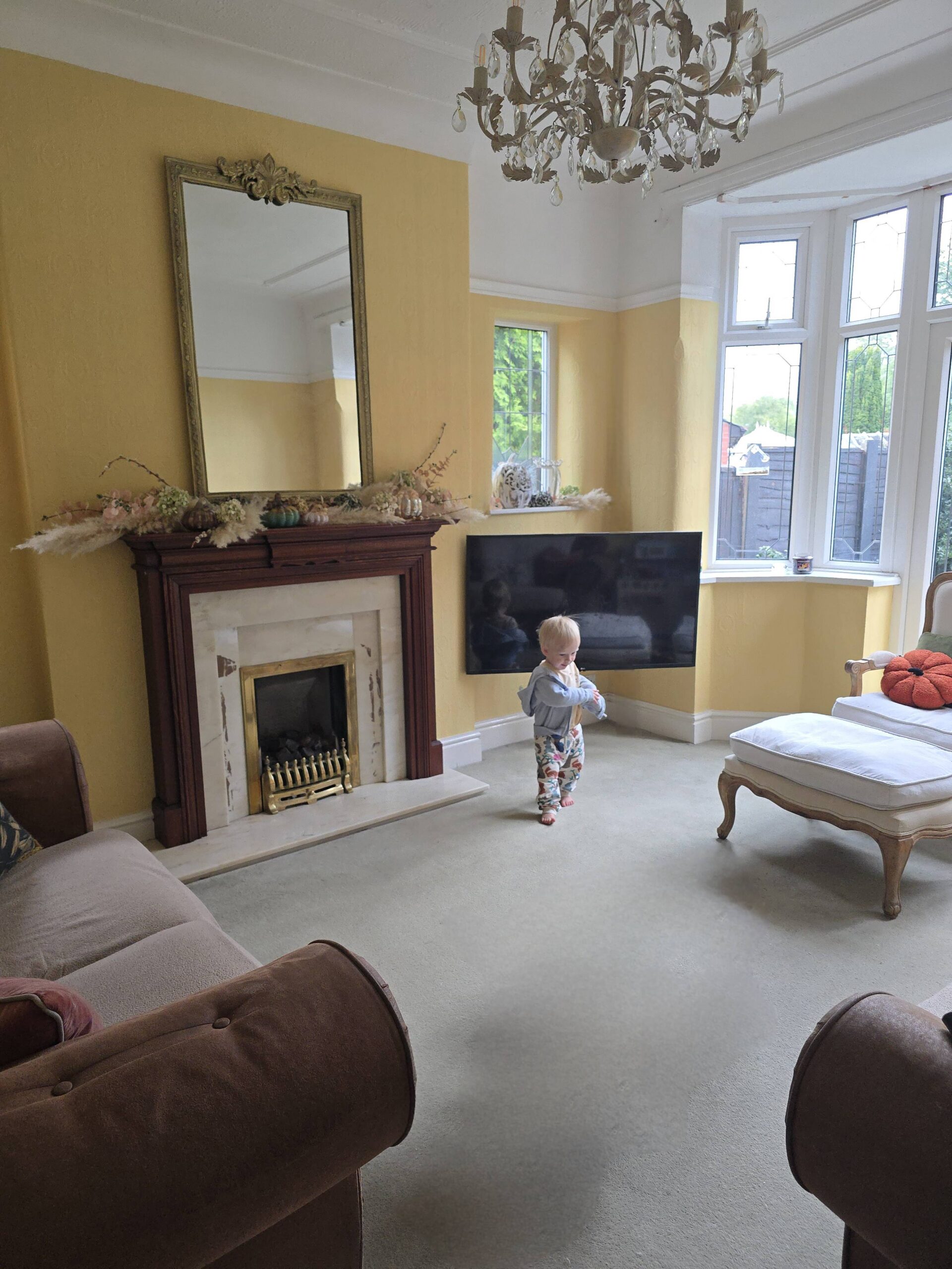 I think I knew it wasn’t quite right after the first couple of brushstrokes, but I soldiered on and painted the whole room anyway. The colour was stunning – it was an absolute joy to paint with such a rich, bright hue. But it was quite a bit brighter than I’d intended. It had a sunflower-like quality that just didnt sit right with the fireplace and sofas. I tried to convince myself (and everyone else) that it worked, that it was the old carpet throwing off the look, the toys, the cushions – but I found myself editing the photos I took of the room and loving the filtered version more than real life. It was close… but it wasn’t it.